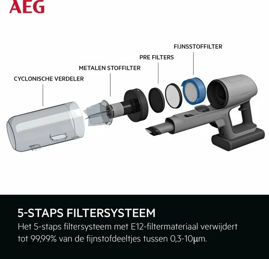 Het luchtfilter bestaat uit een 5-staps filtersysteem. Hierdoor wordt er tot wel 99,99% van de microstofdeeltjes opgenomen voor een schonere uitstootlucht.