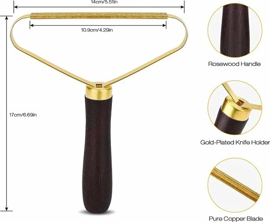 Pakket bevat 1 x draagbare pluizenverwijderaar, 17,5cm in totale lengte, 13cm in breedte. Kleur: bruin. Dubbelzijdig zuiver koperen blad met natuurlijk houten handvat, geschikt voor harde materialen zoals tapijt of gebreide kleding met hoge dichtheid.