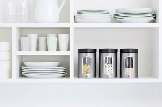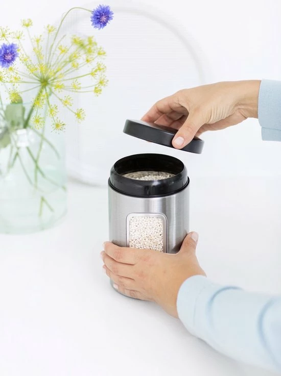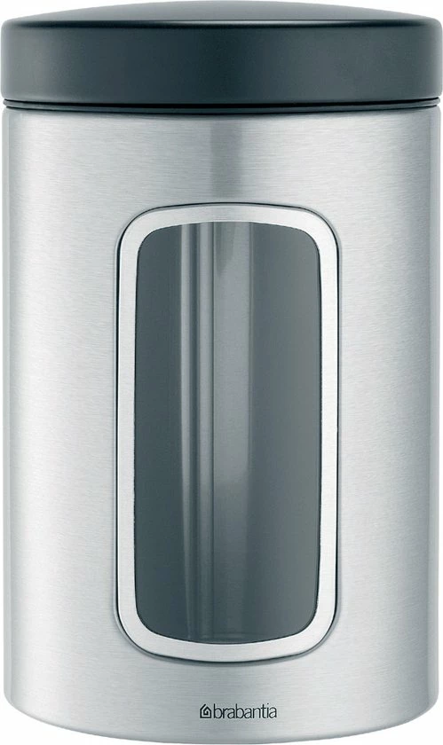 Je kunt bijna alles bewaren in een Brabantia Voorraadbus van 1,4 liter. Op zoek naar een oplossing voor het opbergen en bewaren van koffie, thee, suiker of iets anders? Dan is deze 1,4 liter voorraadbus precies wat je nodig hebt. Dankzij de aromadichte ‘klik’-deksel blijft de inhoud lang goed. Het anti-statisch kunststof venster zorgt ervoor dat de inhoud en hoeveelheid altijd zichtbaar is.