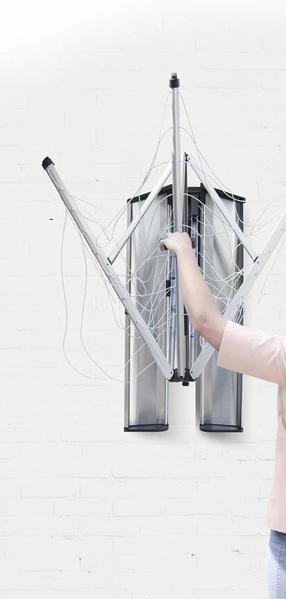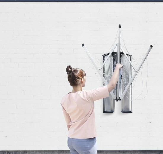 Nooit meer sjouwen of opruimen, eenmaal aan de muur bevestig met je met deze wanddroger altijd direct klaar voor gebruik. Met een soepele bediening met één hand, en 24 meter strakke drooglijn biedt voldoende ruimte voor een complete gezinswas! Met een hand klap je hem eenvoudig uit op 2 vierkante meters. Dit handige model – dat eenvoudig aan een muur bevestigd kan worden – neemt ook uitgeklapt maar heel weinig plaats in en kan heel compact ingeklapt worden. De beschermhoes houdt de wanddroger WallFix schoon en droog indien je deze niet in gebruik hebt. De hoes is gemaakt van sterk, weerbestendig materiaal en blijft goed zitten door de twee drukkers en een stevig koord.