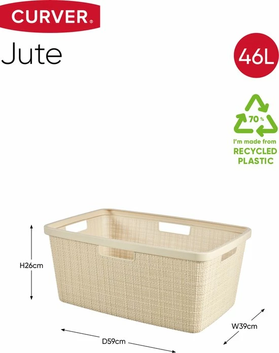 De stijlvolle Curver Jute Heupwasmand 46L heeft een natuurlijke geweven look en feel die elk huis perfect complementeert. De open structuur garandeert optimale beluchting van je wasgoed zodat er geen nare luchtjes onstaan. De brede range bevat ook een wasbox en vijf maten opbergmanden. Alle Jute producten zijn gemaakt van >70% gerecycled kunststof en bieden dus een duurzame oplossing voor het organiseren van je woning.