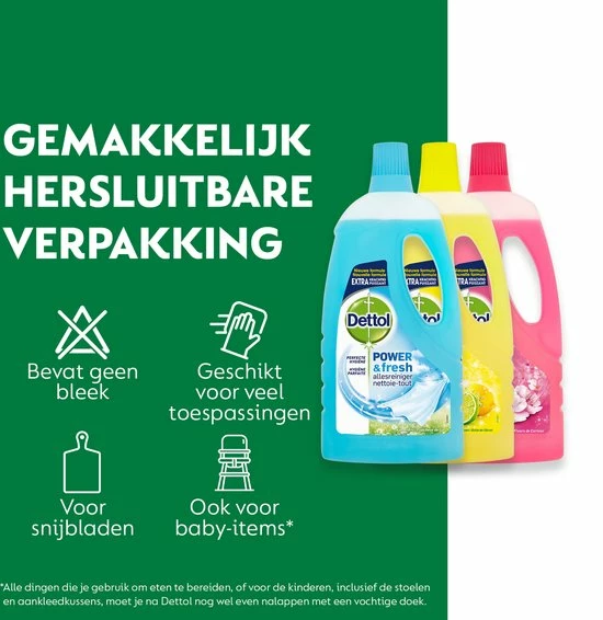 Dettol Power & Fresh katoenfris Allesreiniger zorgt voor een perfecte hygiëne in het hele huis. De driedubbele werking verwijdert gemakkelijk vet, voedselresten en vuil. Dettol Allesreiniger is geschikt voor alle harde en afneembare oppervlakken. De Dettol Power & Fresh allesreiniger laat een zichtbare glans achter en verfrist elke ruimte met een heerlijke, katoenfrisse geur.