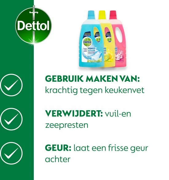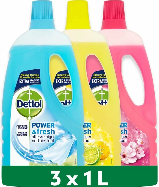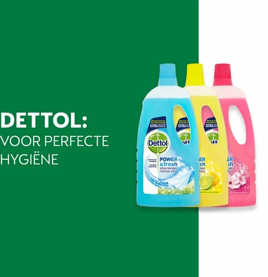 Dettol Power & Fresh kersenbloesem Allesreiniger zorgt voor een perfecte hygiëne in het hele huis. De driedubbele werking verwijdert gemakkelijk vet, voedselresten en vuil. Dettol Allesreiniger is geschikt voor alle harde en afneembare oppervlakken. De Dettol Power & Fresh allesreiniger laat een zichtbare glans achter en verfrist elke ruimte met een heerlijke, kersenbloesem geur.