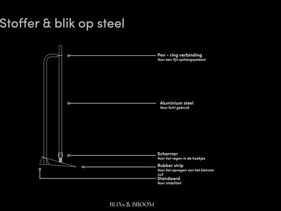 Het stofblik is voorzien van een rubber strip die naadloos aan sluit op ongelijke oppervlakken. Door de aluminium stelen is hij licht in gebruik. Met zijn organische pen-ringverbinding is het gemakkelijk om hem als een geheel terug te zetten.