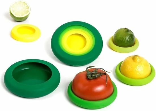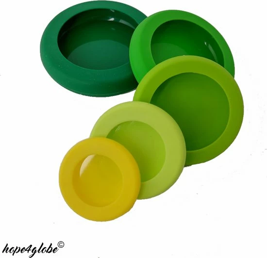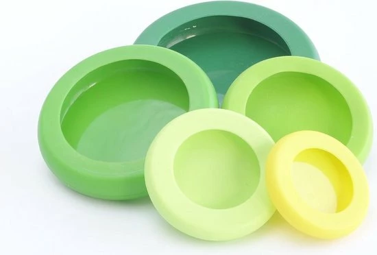 Deze set bestaat uit 5 verschillende formaten. Zo is er altijd een passende oplossing voor elke fles, pot, groente of vrucht. De afmetingen binnen een set zijn:
