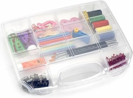 1x Opbergkoffertje/opbergdoos 8-vaks. Deze handige opbergkoffer/opbergbox met een deksel en kliksluiting heeft 8 vakjes van diverse afmetingen. Ideaal om bijvoorbeeld uw naai- of klusspulletjes en ander klein spul in op te bergen. Afmeting: ca. 36 x 28,5 x 6 cm. Materiaal: kunststof. Naaigerei sorteerdoos/opberger.
