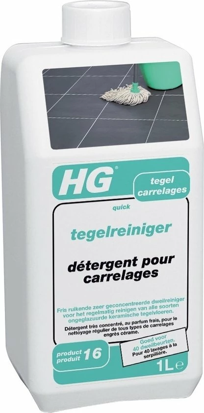HG tegelreiniger is een heerlijk fris ruikende en zeer geconcentreerde dweilreiniger voor alle soorten tegelvloeren, vloeren van niet-kalkhoudende natuursteen en bijvoorbeeld voor siergrindvloeren. HG tegelreiniger is voor het regelmatig goed, veilig en snel reinigen. 1 liter is goed voor wel 40 dweilbeurten.