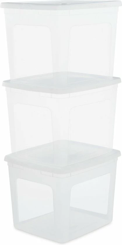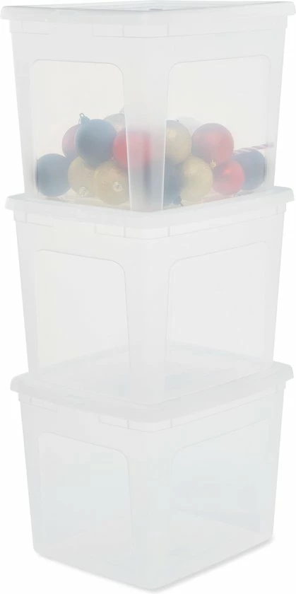 De Clearbox opbergboxen range van Iris Ohyama heeft een eenvoudig maar sterk design. Deze set bestaat uit 3 transparante opbergboxen, heeft een inhoud van 30 liter per box en is voorzien van een goed sluitend deksel. De box is gemakkelijk te combineren met andere formaten dankzij het modulaire systeem. Het transparante materiaal maakt het makkelijk om te vinden wat je zoekt doordat de inhoud gemakkelijk geïdentificeerd kan worden.De deksel is zo ontworpen dat de opbergboxen die er bovenop geplaatst worden niet kunnen verschuiven, er vanaf glijden of kantelen. Ook kan er ruimte gespaard worden doordat de opbergboxen nestbaar zijn en dus in elkaar gestapeld kunnen worden als ze niet worden gebruikt. De producten zijn licht in gewicht, makkelijk te reinigen en duurzaam.