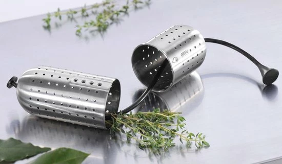 De Gusto kruiden infuser van Gefu is perfect om kruiden en smaak toe te voegen aan gerechten zoals soep en stoofschotels. Op die manier kun je kruiden zoals bijvoorbeeld laurier, kruidnagel of takjes verse kruiden eenvoudig in je gerecht laten trekken en weer makkelijk verwijderen. De infuser bestaat uit 2 helften die op 4 verschillende standen kan worden ingesteld, afhankelijk van het formaat kruiden dat je gebruikt. Verder is de infuser voorzien van een siliconen koord wat de 2 helften bij elkaar houdt. Dit koord kun je gemakkelijk vastmaken aan de handgreep van de pan zodat de infuser blijft hangen. Hij kan gemakkelijk uit elkaar gehaald worden en is geschikt voor de vaatwasser.