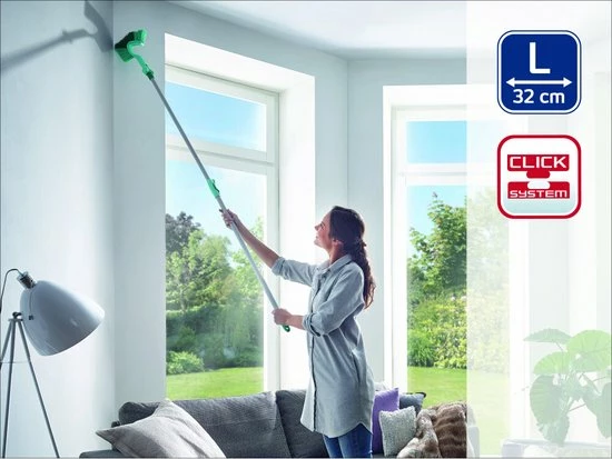 De stofbezem van Leifheit verwijdert door zijn driehoekige vorm moeiteloos spinnenwebben, vuil en stof uit elke hoek. Met het gebruik van het Clicksysteem, van de apart verkrijgbare telescoopsteel van Leifheit, zijn ook alle hoge hoeken, plafonds en muren makkelijk te reinigen. Kan onder stromend water worden gereinigd. 3 jaar garantie.
