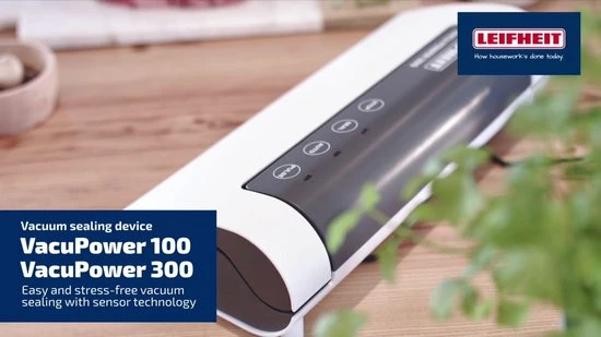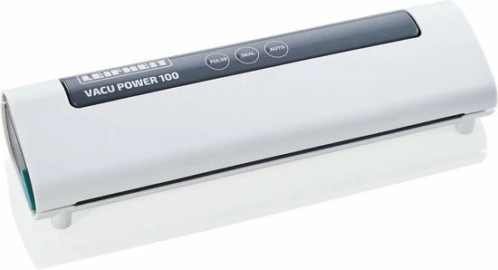 Bovendien heeft vacuümapparaat Vacu Power 100 een vacumeerfunctie voor vacuümbewaardozen. Deze bewaardozen en de benodigde vacumeerslang zijn afzonderlijk te koop bij Leifheit. Dit vacumeerapparaat heeft elektronische temperatuurbewaking, om doorsmelten van de sealnaden te verhinderen. Dat is wel zo veilig. Verder is de vacumeerder plaatsbesparend op te bergen, dankzij het compacte formaat. Er worden tien Leifheit vacuümzakken in de maat 20 x 30 cm meegeleverd. Maar bij dit apparaat kunnen alle gangbare vacuümrollen en vacuümzakken met een maximale breedte van 30 cm gebruikt worden.