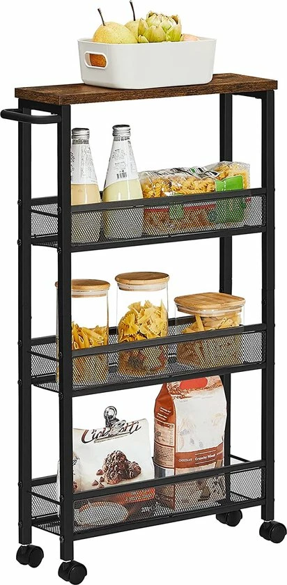 - Waar ontbreekt er iets? In de keuken, om kruiden in te doen? In de eetkamer om hapjes en drankjes te bewaren? In de studeerkamer om kantoorspullen zoals pennen en notities in op te bergen? Deze smalle trolley is geschikt voor vele situaties