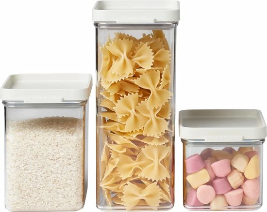 De Omnia set bewaardozen 3-delige in Nordic white helpt je met het bewaren van alles wat je lekker vindt: van de lekkerste koffie tot overheerlijke pasta en van krakende cornflakes tot een kilozak meel. De set bestaat uit drie bewaardozen met deksel, met een inhoud van 700 ml, 1100 ml en 2000 ml. Dankzij de stijlvolle kleuren zijn ze niet alleen ontzettend praktisch in je keukenkastje, maar staan ze ook nog eens prachtig op je aanrecht. De voorraaddozen sluiten stuk voor stuk luchtdicht af, zodat jij langer van je etenswaren kunt genieten.