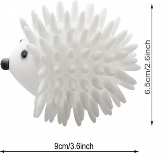 De kleine witte egel is een thermoplastische rubberen bal met een zeer goede flexibiliteit en neemt geen ruimte in beslag voor kleding. De ongelijke stekels van de egel kunnen een warme ruimte creëren die helpt bij het wassen en drogen, waardoor de droogtijd wordt verkort en energie wordt bespaard. De egeldroger absorbeert pluisjes en voorkomt statische elektriciteit, gaat klitten tegen en vermindert kreukels.
