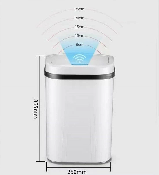 De sensor reageert op beweging op een afstand van 5 tot 25 cm waarbij het no-touch prullenbakdeksel direct open gaat. Nadat de sensor 5 seconden niets heeft gedetecteerd gaat het deksel ook automatisch weer dicht. Wilt u dat het deksel langer open blijft staan dan kunt u dit simpel regelen door op de ‘open’ knop te drukken; het deksel blijft dan net zo lang open staan totdat u op de ‘sluit’ knop drukt.