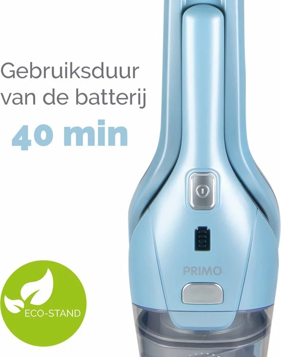 De PRIMO PR507SV 2-in-1 steelstofzuiger zonder zak / kruimelzuiger is je ideale hulpje om snel wat op te zuigen. Zo blijft je vloer schoon zonder direct de grote bedrade stofzuiger te moeten pakken. Ook heeft de PR507SV een flexibele borstelkop om gemakkelijk in ieder hoekje of onder banken te komen. De krachtige 18 V Lithium-Ion accu geeft je maar liefst 40 minuten kracht op de ECO stand als kruimelzuiger. Is de zuigwerk toch hardnekkiger dan schakel je over naar de TURBO stand met 20 minuten zuigkracht via de borstelkop. De Flexibele borstelkop met LED-verlichting is geschikt voor alle vloertypen. Doordat de PR507SV Steelstofzuiger draadloos is, heb je complete bewegingsvrijheid. Als je de steel verwijderd verander je de Handstofzuiger in een kruimelzuiger. De PR507SV komt in de kleur Blauw.