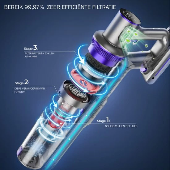 Efficiënte filtratie – De supercycloon en het dubbele luchtinlaatfilter (HEPA-filter + filterspons) gegenereerd door de dubbele kegel structuur kunnen de stofdeeltjes maximaal isoleren en de lucht zuiveren. Dit kan stof verstopping effectief verminderen, de motor beschermen en de levensduur van de stofzuiger verlengen.