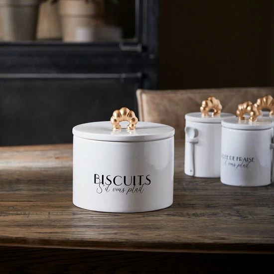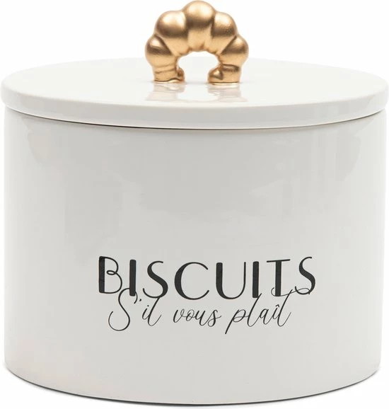 Deze voorraadpot van wit porselein voorkomt dat jouw koekjes slof worden. Door de siliconen ring aan de binnenkant van het deksel, sluit de voorraadpot goed af en blijft alles wat je erin bewaart langer vers en krokant. Een goud croissantje vormt de handgreep op het deksel.
