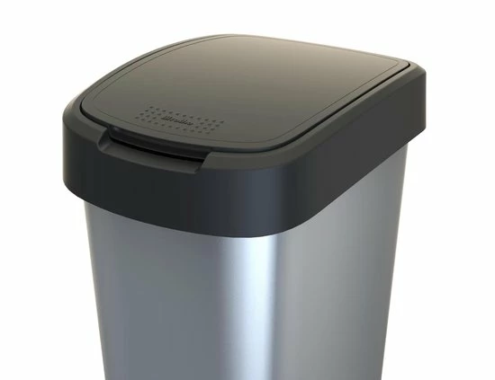 Deze rechthoekige Twist afvalbak van Rotho heeft een moderne industriële look en heeft een robuust design. De afvalbak, uitgevoerd in zilver zwart past perfect binnen iedere inrichting. Vingerafdrukken vind je niet terug op deze afvalbak en ook is hij gemakkelijk te reinigen met een doekje. Daarnaast is de afvalbak gemaakt van duurzaam kunststof en is hij voorzien van een handig kanteldeksel die op 2 manieren te openen is. De vuilniszak is eenvoudig te bevestigen aan een losse binnenring. De afmeting van deze Twist afvalbak is 40,1 x 29,8 x 60,2 cm en heeft een inhoudsmaat van 50 liter.