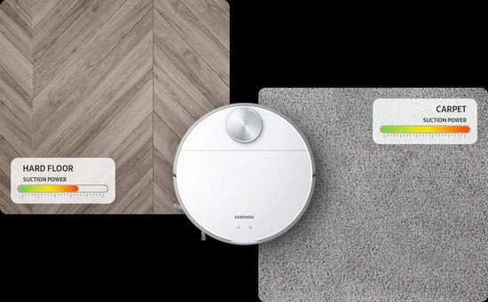 De Jet Bot robotstofzuiger van Samsung kan harde vloeren en tapijten grondig reinigen. Om het nog makkelijker te maken, wordt de zuigkracht automatisch aangepast aan het type vloer dat wordt gereinigd. Bij dieper tapijt wordt de zuigkracht verhoogd, om nog beter te reinigen met de power control-technologie. De hoogrenderende borstel gemaakt van fijne vezels en zacht geweven textiel, zorgt voor minder klitten, waardoor de prestaties betre zullen zijn.