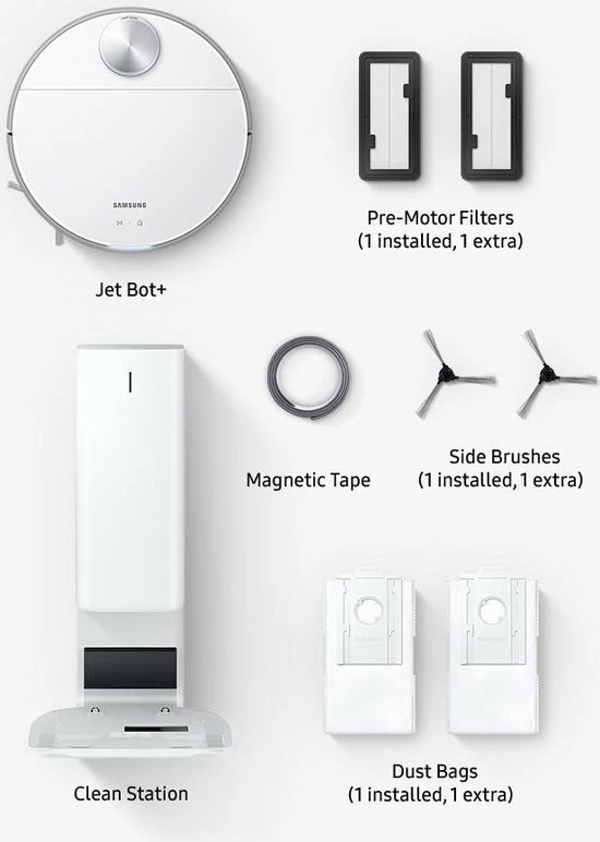 - LiDAR-sensor – Clean Station – Hoogrenderende borstel – Bediening via de app – SmartThings – Digital inverter motor – Geschikt voor harde vloeren en tapijten – Intelligent Power Control – Wasbare vuilnisbak – No-go-zones – Select & Go – Live Cleaning Report – EZ Clean stofreservoir