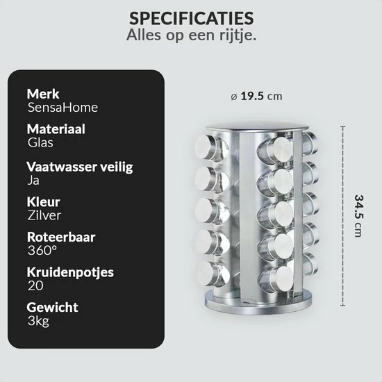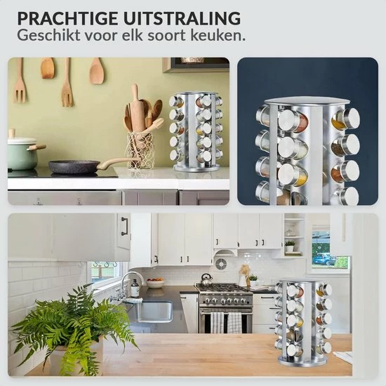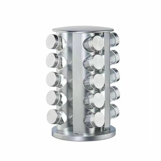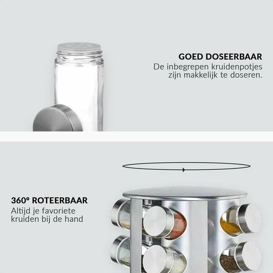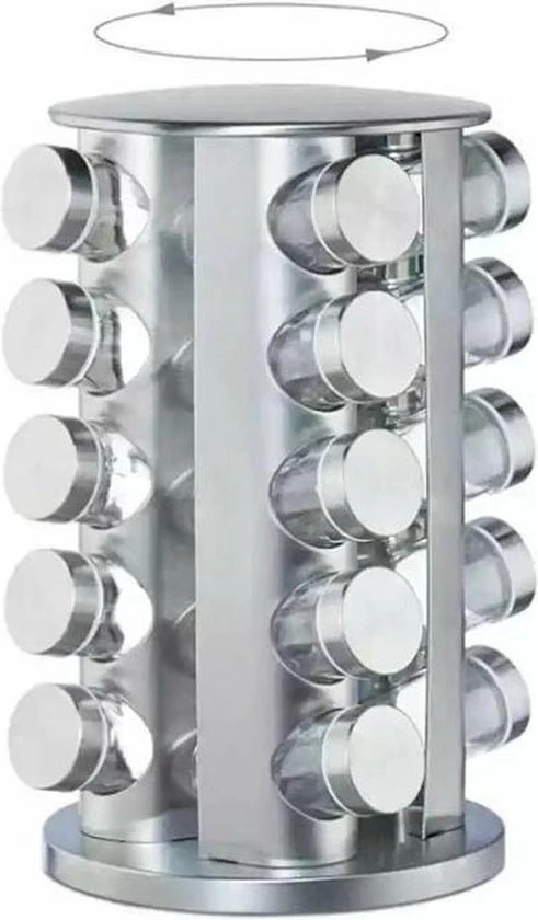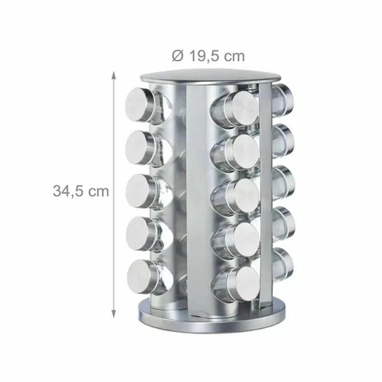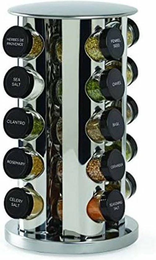 Het is afgelopen met de chaos in het keukenkastje. De moderne kruidencarrousel van roestvrij staal zorgt voor orde op het aanrecht. 20 glazen potjes voor het bewaren van al je kruiden zoals curry, paprikapoeder en zout. Onder het kruidenrekje is een kunststof schijf gemonteerd die het mogelijk maakt het rek te draaien. Zo kom je heel makkelijk bij al je kruidenpotjes. De glazen potjes zijn verdeeld over 5 etages en kunnen dankzij de strooigaatjes direct als strooipotjes worden gebruikt.