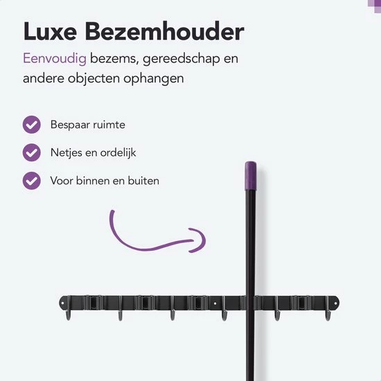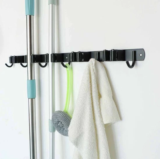 Is het ook een rommeltje in jouw berging, garage of tuinhuis? Staan de bezems en vloerwissers slordig in een hoekje geduwd? We kennen het allemaal, je krijgt de deur niet open, want daar ligt de bezem, de hark, de spade, … Deze Zwarte Luxe bezemhouder van 60cm, met 5 rubberen klemhaken en 6 ophanghaken, brengt DE oplossing.
