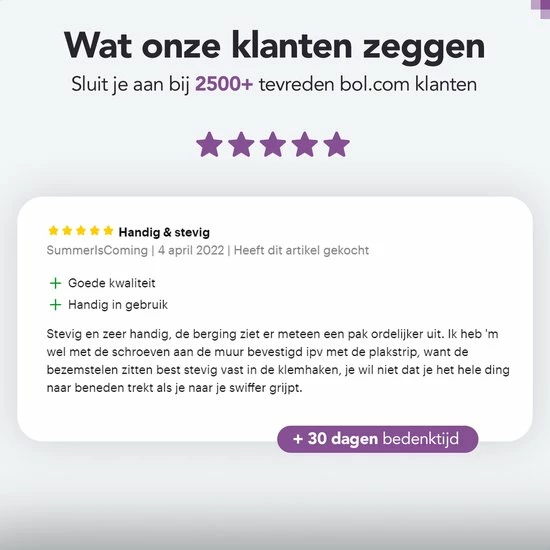 De bezemhouder is eenvoudig te installeren, zie bijgevoegde handleiding en wordt geleverd inclusief bevestigingsmateriaal met pluggen, schroeven en afdekplaatjes.