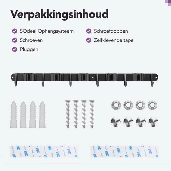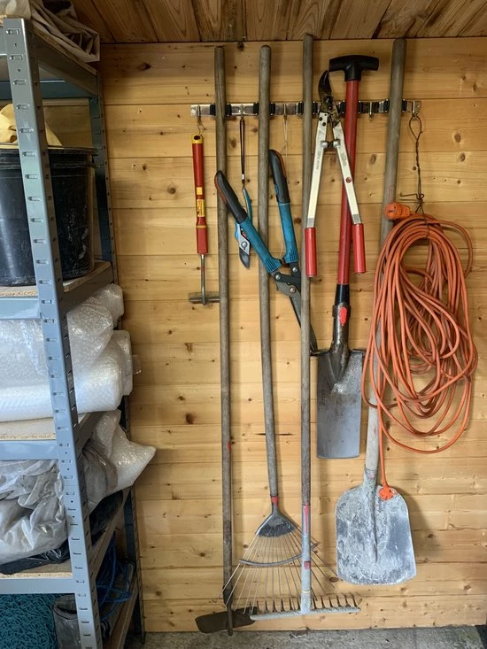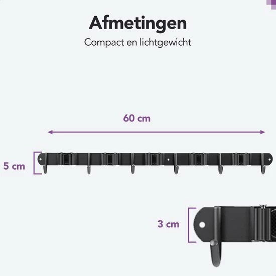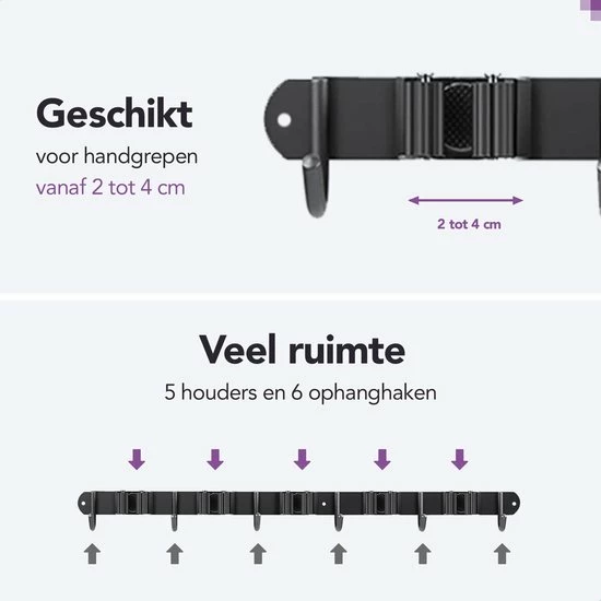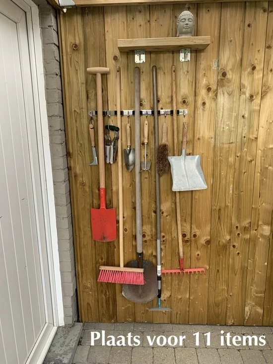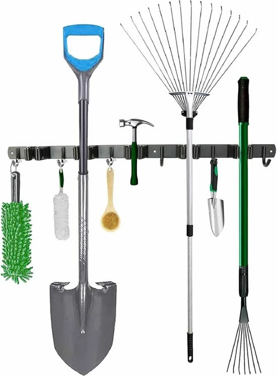 Dankzij deze uitvoering kan je tot 5 bezems, spades, vloerwissers, … opbergen en de 6 haken kan je gebruiken voor accessoires zoals emmers, handveger en blik, tuingereedschap, handtassen, sporttassen, …
