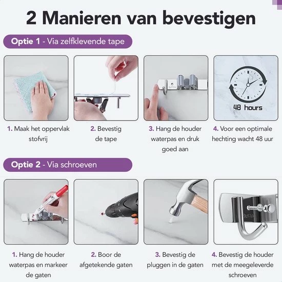 De organizer is gemaakt van roestvrij staal, waardoor je deze gemakkelijk kan gebruiken in zowel vochtige ruimtes als buiten. Door de combinatie van houders en haken, kan je veel verschillende artikelen ophangen. De houder is gemaakt van duurzaam materiaal en bevat anti-slip rubberen houders, zodat je deze jaren kan gebruiken.
