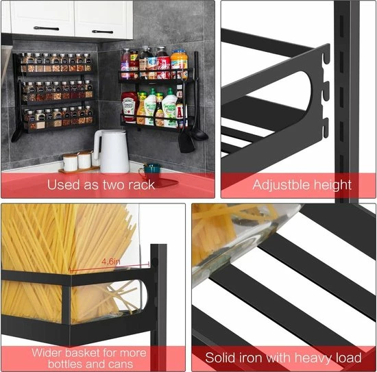 - DUAL GEBRUIK DESIGN: Deze kruidenrek organizer wordt niet alleen gebruikt als een enkel 5-tier rek maar als twee gescheiden rekken volgens uw behoefte of uw ruimtegrootte. Bevestig aan de muur, deur of zet in kast of bijkeuken om uw keuken opgeruimd en netjes te houden.