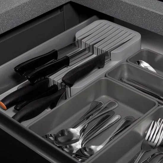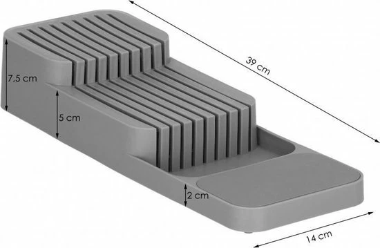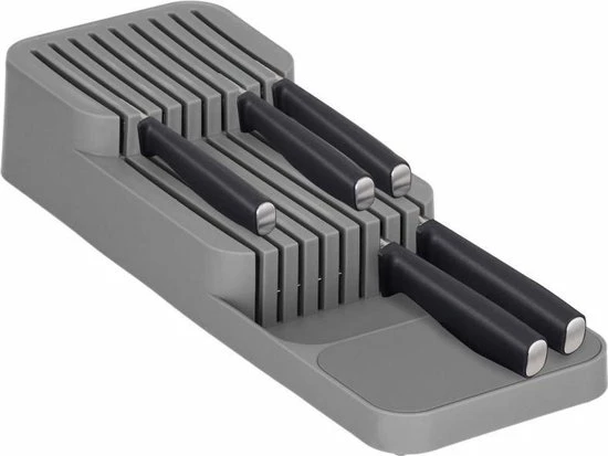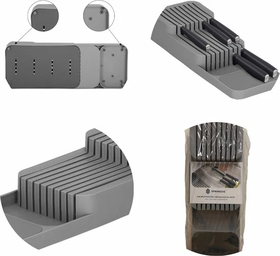 Deze handige messen organiser van Springos is het ideale accessoire voor in jouw keuken, als je al die rondslingerende messen in de keukenlade zat bent. Zo berg je jouw messen op een veilige manier op en blijven deze van een goede kwaliteit. De organiser is voorzien van twee gestapelde compartimenten voor maar liefst negen messen. Dit betekent dus dat er altijd wel een slot voor jouw favoriete mes beschikbaar is. Zelfs koksmessen met een lemmet van maximaal 23 centimeter kunnen hierin bewaard worden. Doordat de organiser is voorzien van anti-slip voetjes schuift deze niet heen en weer bij het openen of sluiten van de keukenlade. De organiser is niet geschikt voor de vaatwasmachine, maar makkelijk met de hand schoon te maken en geschikt voor lades met een maximum hoogte van 8 centimeter.