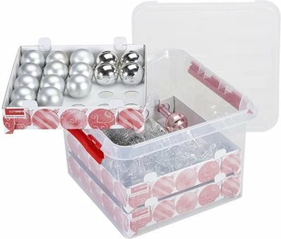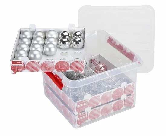 | Verpakkingsinhoud | Q-line, kerst, opbergbox, 26L, met, trays, voor, 75, kerstballen, transparant, rood |