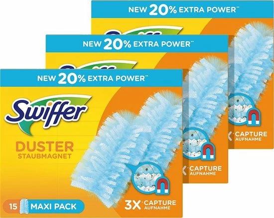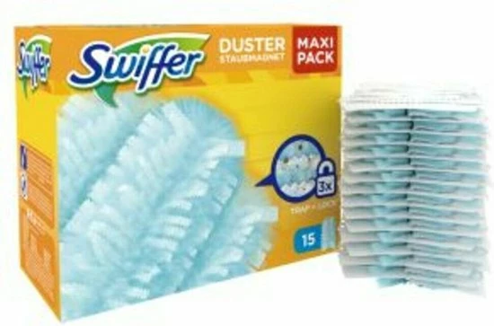 Dit is een voordeelverpakking van 3 x 15 navullingen voor de Swiffer Duster. Vangt en houdt stof, haar en allergenen vast; (van huisstofmijten, maar ook van katten en honden).