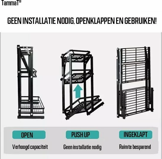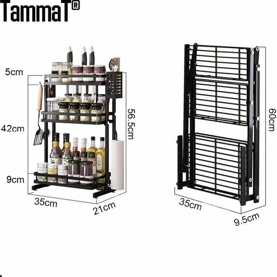 Deze TammaT® kruidenrek is precies wat je nodig hebt in de keuken. Bespaar geld en ruimte met ons staand kruidenrek. Tammat® 2 of 3-laags kruiden heeft bredere ruimte om genoeg accessoires te dragen. Dit unieke Kruidenrek komt met grote messenhouder, bestekhouder, keukenrol houder en ophang haakjes voor je keukengerei. Kruidenrek is inklapbaar, waardoor het met gemak kunt verplaatsen, dat is ideaal wanneer je de rek wilt verplaatsen om te schoonmaken en/of tijdelijk niet wilt gebruiken.