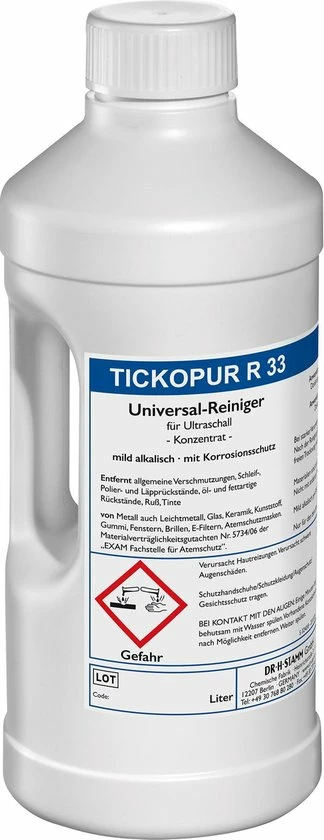 Tickopur R33 is speciaal ontwikkeld voor het gebruik in een ultrasoon reiniger, waardoor deze grote voordelen heeft ten opzichte van een huis-, tuin- en keukenmiddeltje. Het gebruik van een ultrasoon vloeistof zorgt ervoor dat je ultrasoontank niet onnodig sneller slijt, je voorwerpen niet verkleuren en je de kwaliteit van de reiniging tot 30% kunt verbeteren. Wist je dat de ultrasoon vloeistoffen van Tickopur bijna allemaal concentraten zijn? Hierdoor kun je van 2 liter Tickopur R33 maar liefst 50 liter (uitgaande van een dosering van 4%) oplossing maken! Daarnaast zijn alle vloeistoffen meerdere keren te gebruiken, tot dat deze verzadigd zijn. Tickopur R33 is een universele reinigingsvloeistof met corrosie bescherming.