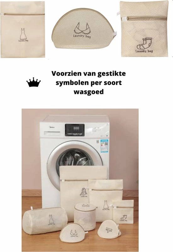 De set bestaat uit 7 delen en heeft diverse maten die passen bij al uw kleding. Ideaal voor de fijne was voor bijvoorbeeld uw lingerie, truien, bh’s of bijvoorbeeld uw babykleding. De zakken beschermen uw delicaat wasgoed tegen het haken, klitten of trekken in de wasmachine of wasdroger waar ook de kans van het overvloeien van kleuren wordt geminimaliseerd! De waszakken zijn ademend en laten lucht en water door voor een optimale reiniging. Daarnaast zijn de waszakken ideaal om mee op vakantie te nemen, u sorteerd uw kleding gemakkelijk in uw koffer.