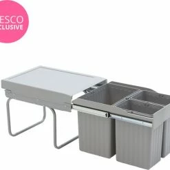 Uittrekbare afvalbak met drie kunststof binnenbakken die uitstekend geschikt zijn voor drievoudige afvalscheiding. Daarin kunnen b.v. organisch afval, restafval en papierafval of flessen praktisch worden gescheiden. De uittrekbare afvalemmer is bijzonder ruimtebesparend en kan gemakkelijk met vier schroeven in een aanrechtkast worden gemonteerd. Hij is geschikt voor aanrechtkasten met een breedte van ten minste 40 cm. De ingebouwde bak is volledig uittrekbaar, d.w.z. dat hij tot zijn volle lengte kan worden uitgetrokken. Door zijn hoogte van slechts 34 cm is hij ook geschikt voor installatie onder een volumineuze gootsteensifon.